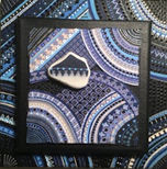 Another thread of her collage work is currently being exhibited in the Seagull Gallery. These artworks are inspired by the patterns found on fragments of sea pottery from the west and east coast beaches of Scotland. The art work is painted with acrylic pens and paints on canvas and included the found pottery which is the centrepiece of each painting.