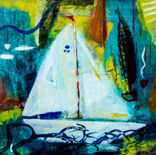In the beginning of a piece Aileen paints and draws intuitively using a variety of materials and building up layers of colour, scraping through and sanding back until the design forms naturally. This can take weeks or even months until she sees all parts coming together and leading the way forward to a conclusion.